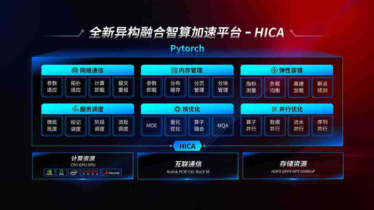 通过自研的服务层、、、中间适配层、、、、以及调度编排算法,,,采用数据并行、、、模型并行等多种并行方式,,把并行计算任务进行有效的分解,,,使其分别由相应的软件栈和算力资源来承接。。。。当GPU资源变化,,HICA可以实时动态调度计算子任务并调整模型拓扑和架构,,,,以充分聚合各种算力资源。。。。